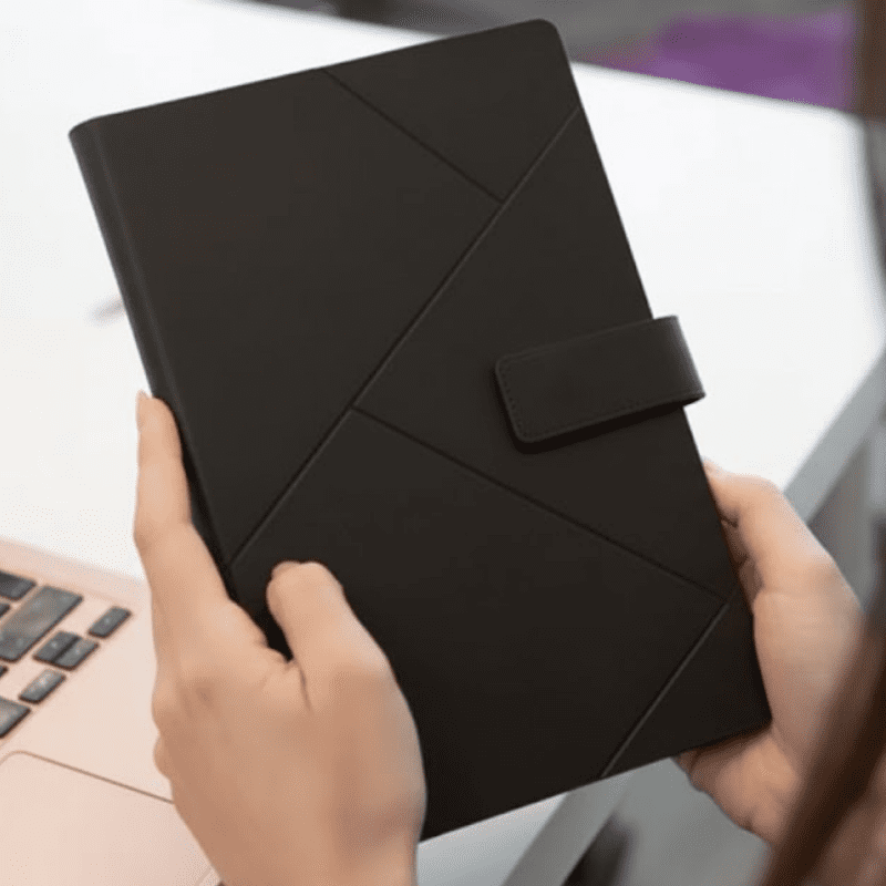 Cubierta suave de curpiel. Tu logo grabado (hot stamping) es elegante y duradero.
