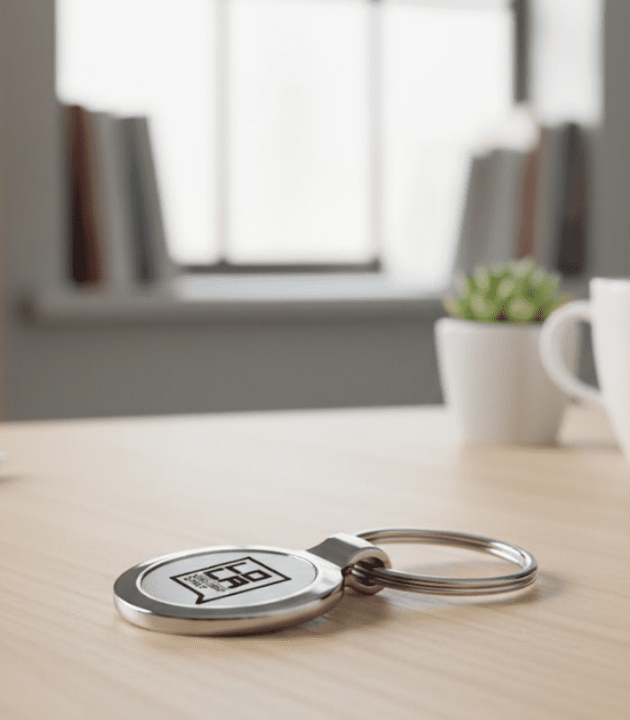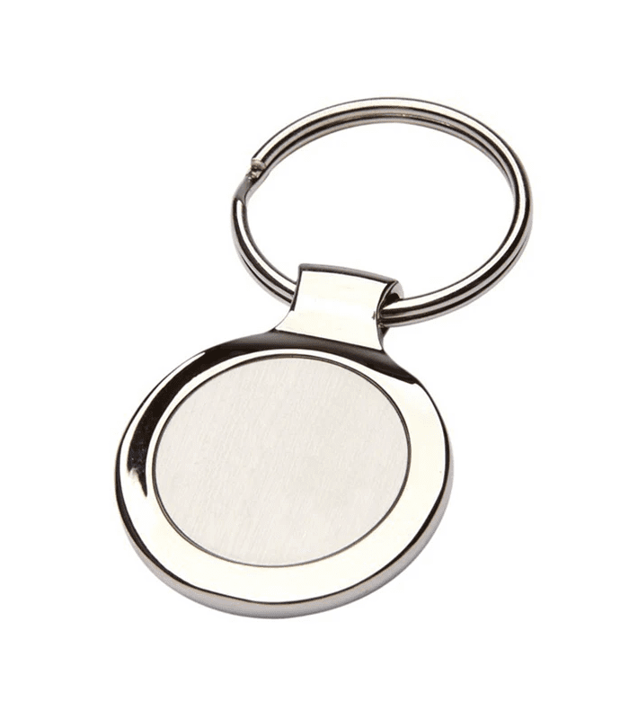 Llavero metálico plano. Tu logo grabado con precisión láser.