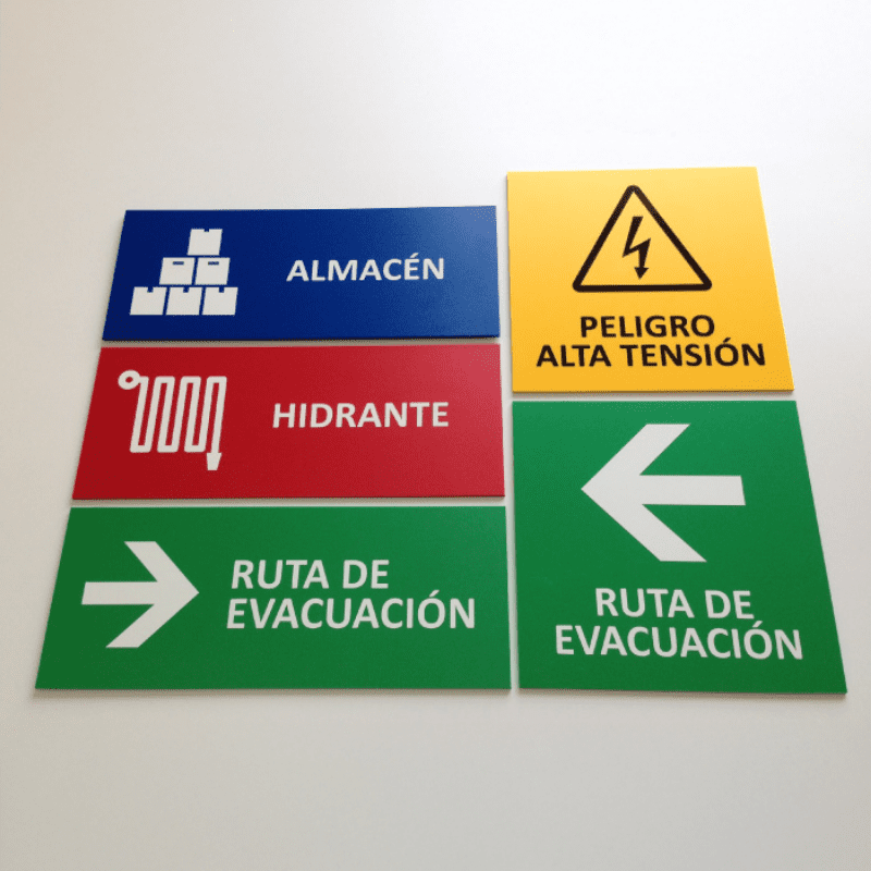 Material plástico ideal para avisos de seguridad y directorio. Ligero y fácil de montar en interiores y zonas secas.
