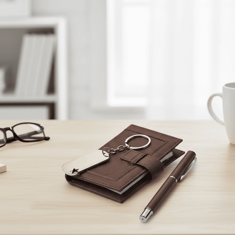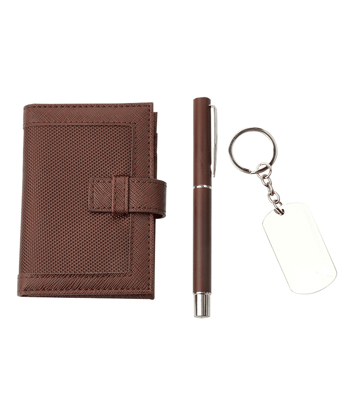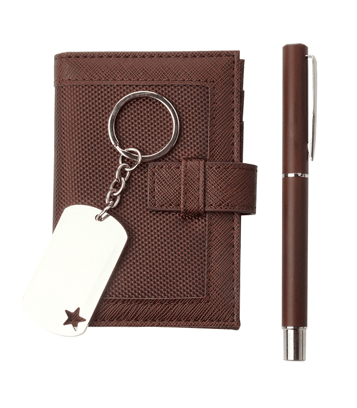 Incluye libreta, bolígrafo, llavero y estuche de presentación.