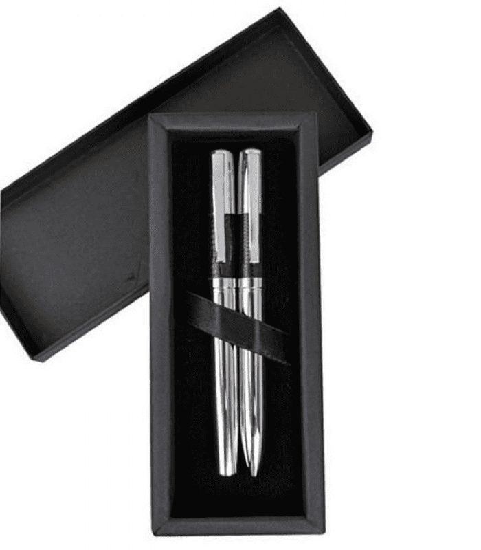 Elegancia pura en un set. Elige el acabado cromado o mate para que tu logo grabado contraste perfectamente. Ideal para clientes y partners de alto nivel