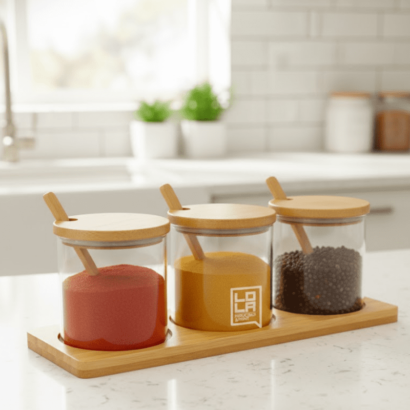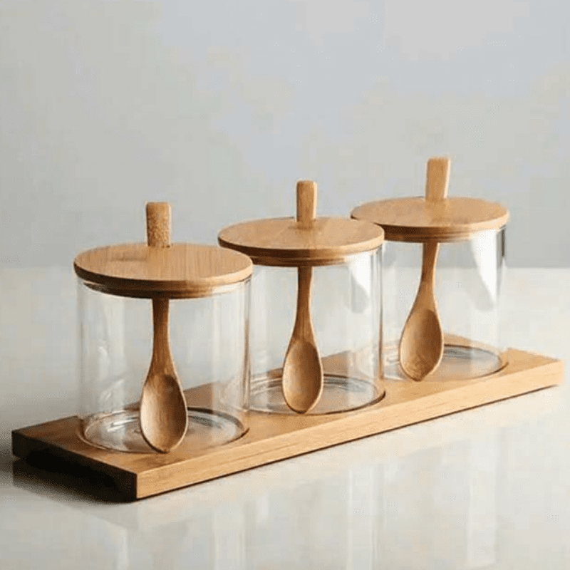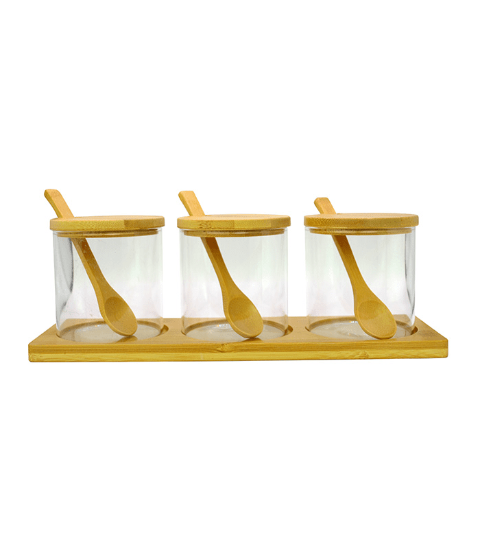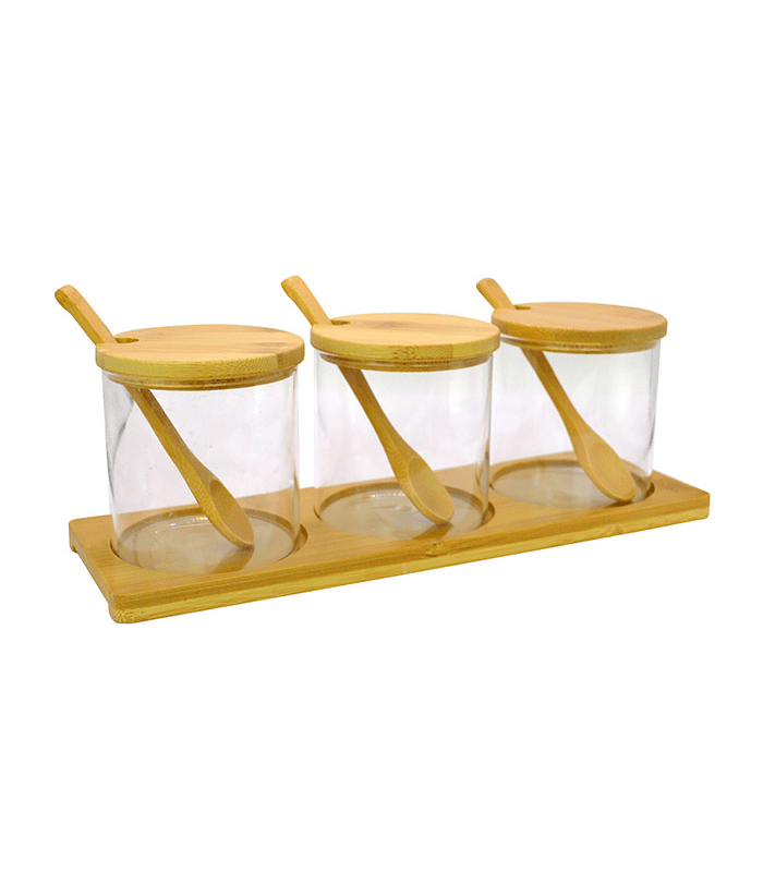 Juego de 3 recipientes con tapa de bambú y cuchara.