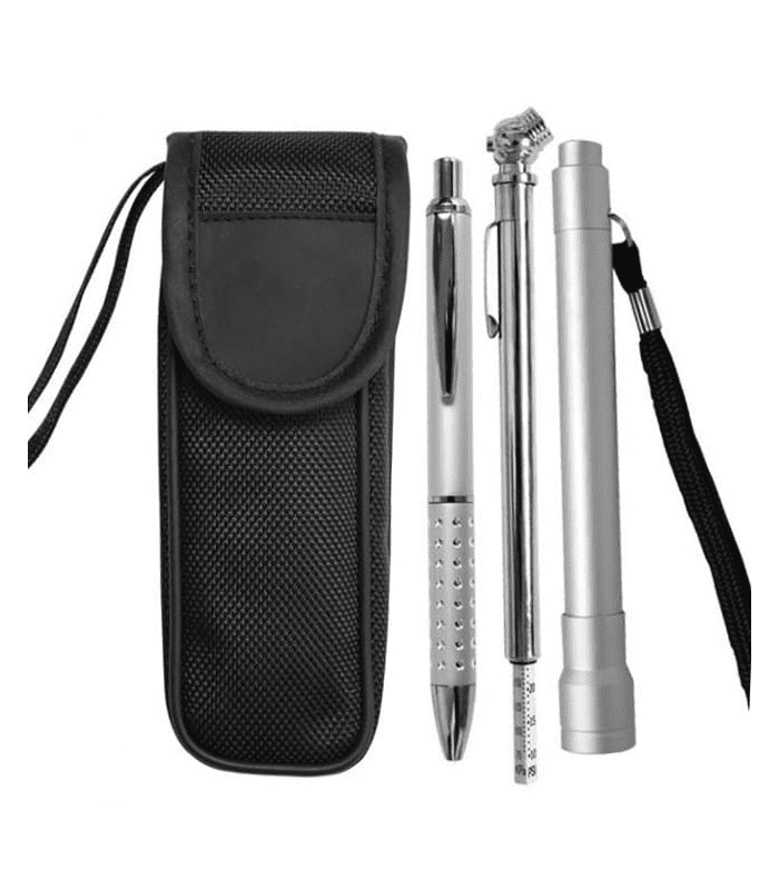 Incluye, linterna, bolígrafo y calibrador para llantas.